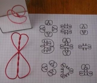 Pokud vycházím z posledních modelů, tak mi zbývají dva volné konce, které se samozřejmě přímo nabízí ke svému vzájemnému propojení. Konce míním spojovat lepením šikmých přeplátování, protože mě nic lepšího zatím nenapadá. Na přiložené fotografii je drátěný model nejjednodušší varianty, která má jádro tvořené dvojicí zkroucených vodičů, které jsou na vnější spirále navzájem propojené. Jádro může být tvořené i třemi či čtyřmi vodiči a spirály pláště mohou být spojované různým způsobem, což je na fotografii naznačeno schematickými malůvkami. V nich menší dvojzávity naznačují části jádra a větší závit vnější spirálu pláště. Nenechte se zmýlit zdánlivou tvarovou rozmanitostí variant zapojení - vždycky se jedná pouze o zkroucené jádro a nějak vzájemně poslepované konce vnějších spirál. "Elektricky" se pak jedná vždy o uzavřené obvody, tedy buďto jeden jediný, zahrnující postupně všechny části propojené "do série", a nebo o více samostatných obvodů, připomínajících spíše transformátor.