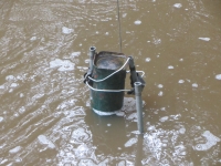 No, když nám to fungovalo s tím kýblem na výtoku, tak to zkusíme i pod vodou. Aby voda proudila ventilem dost rychle, potřebuje mít za ventilem mnohem nižší tlak, takže dáme za trkací ventil větší vzdušník a když v něm bude jenom atmosférický tlak, tak do něj voda radostně poteče protože nepozná, že to není nad hladinou nebo o pár metrů doleji. Při podtlaku si pracovní trubka tu vodu zase vcucne tu vodu zpátky a použije ji příště.